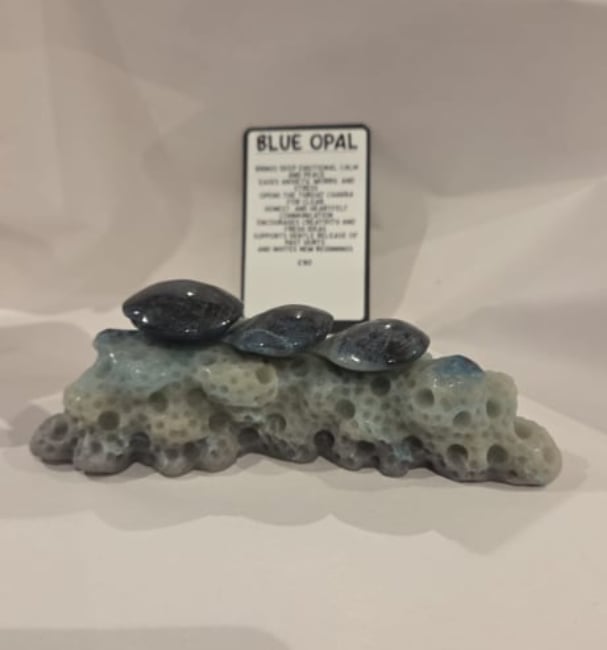 Owyhee blue opal is a high-vibration stone from Oregon thought to connect to spiritual guides and promote intuition, creativity, and communication. Its metaphysical properties include fostering serenity, releasing fears and confusion, enhancing psychic abilities, and connecting to the Throat and Third Eye Chakras for clarity and inner strength. This soothing stone is used in meditation and as a dream stone to facilitate spiritual insight and empower one's voice and character.
